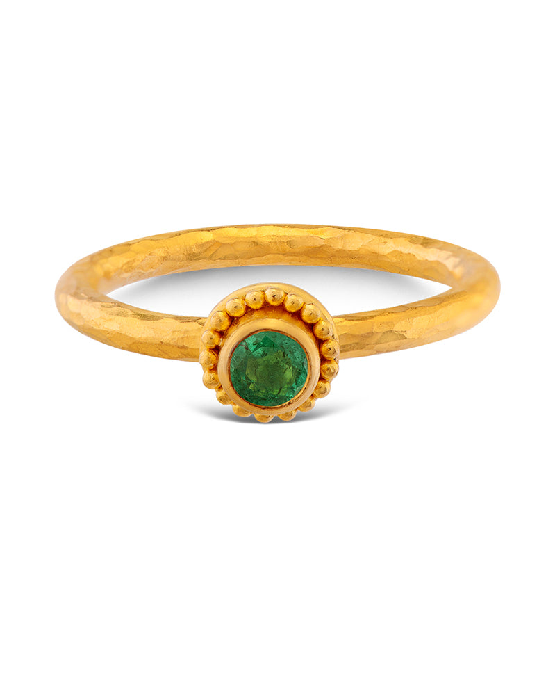 The ring features a beautifully hand-hammered band of pure 24k gold, giving it a rich, organic texture that is both soft and luxurious. At its crown, a vibrant, round emerald is set in a classic golden bezel. Surrounding the bezel is a meticulously applied border of fine gold granulation, creating a subtle, "bloom" effect that perfectly complements the gem's intense green hue.