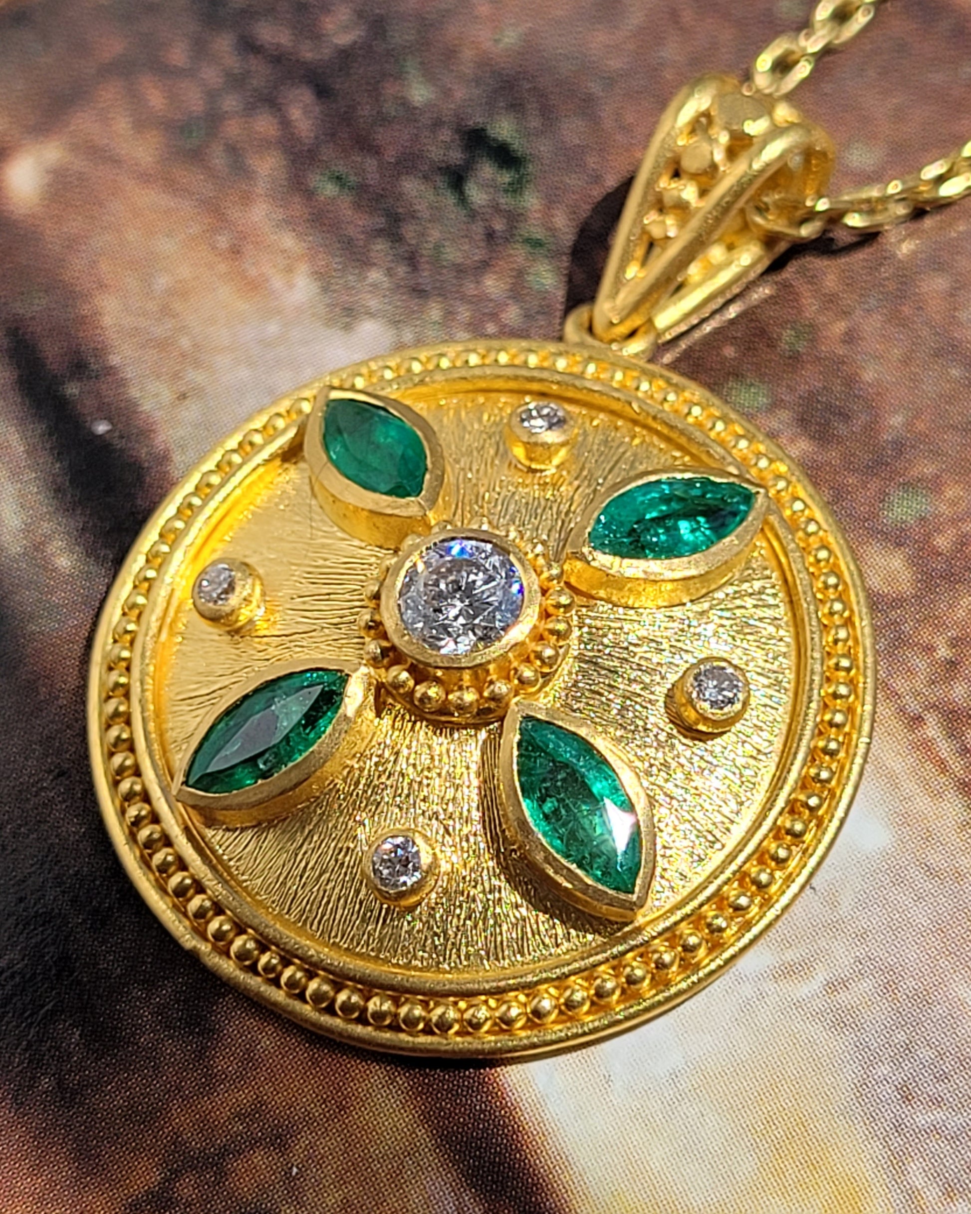The pendant's circular form is a canvas of pure 24k gold, meticulously handcrafted with a radiating texture and delicate granulation work. At the center lies a brilliant-cut diamond, representing a guiding star. This central gem is surrounded by four marquise-cut emeralds, placed at the cardinal points like the needles of a compass. Their deep green hues offer a stunning contrast to the luminous gold.