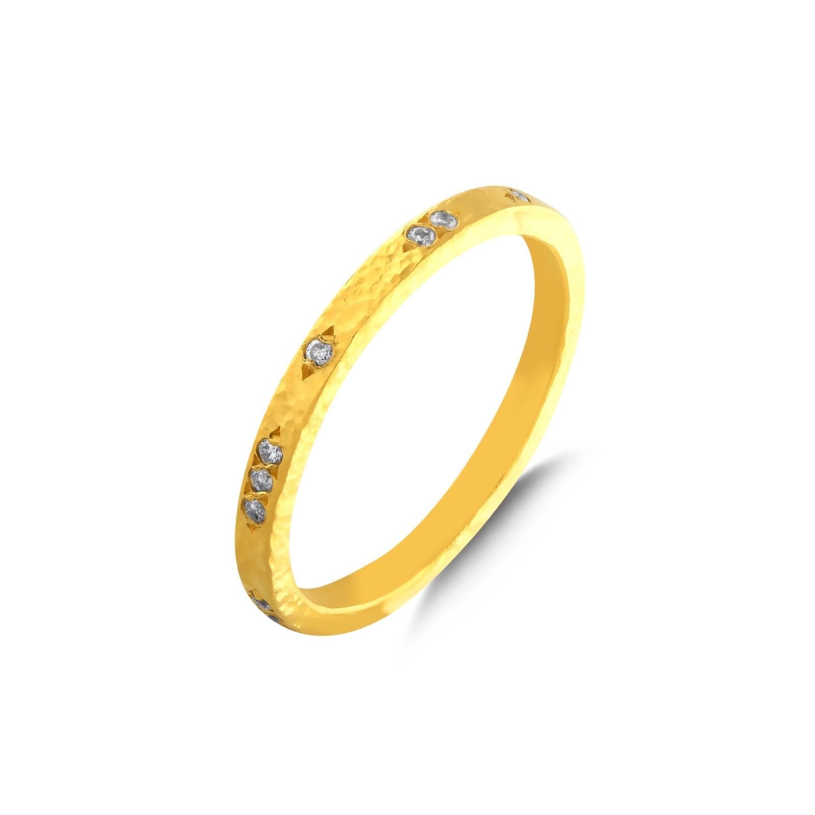 Crafted entirely from radiant 24k gold, the band features a subtle hammered texture that whispers of hand-forged treasures from antiquity. Along its surface, a scattering of brilliant-cut diamonds sparkle like tiny stars against a golden night sky. Each diamond is expertly set, adding a captivating shimmer to the ring's warm, rich hue.